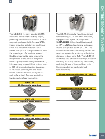 133GENERAL PURPOSE DRILLINGThe MD-DR-DH %u2026 carry standard SOMX indexable inserts with 4 cutting edges, providing an economical solution. A wide range of grades and chipformers SOMX inserts provide a solution for machining holes in a variety of materials. It is a known and proven design combined with the advantages of a modular system. Double-ended guide pads ensure the straightness of the bore and improve surface quality. When using MD-DR-DH %u2026, it is necessary to pre-drill flat bottom hole of 1XD minimum depth with a tolerance of H8. Used correctly, this drill head stands out with excellent straightness and surface finish. Recommended for low to medium feed machining.SOMX %u2026-DTDT chipformer for general useSOMX %u2026-GFGF chipformer for soft materialsSOMX %u2026-HDHD chipformer for carbon steel and soft materialsThe MD-MNC modular head is designed for machining ISO P and ISO K materials, equipped with a pilot exchangeable SUMO-CHAM drilling head (designated as ICP %u2026-MNC) and peripheral indexable inserts (designated as WCGX %u2026-W). This modular head allows for drilling without the need for a pre-hole, achieving a depth-todiameter ratio of up to 8xD. The MD-MNC combines cost efficiency with high precision, ensuring accuracy, cylindricity, roundness, and straightness of the machined hole. Recommended for medium to high feed machining.Pilot exchangeable drilling head ICP %u2026-MNCPeripheral indexable inserts WCGX %u2026-W
