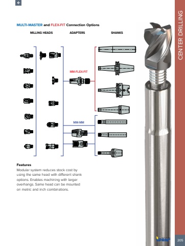 205CENTER DRILLINGMULTI-MASTER and FLEX-FIT Connection OptionsMILLING HEADS ADAPTERS SHANKSMM-MMMM-FLEX-FITFeaturesModular system reduces stock cost by using the same head with different shank options. Enables machining with larger overhangs. Same head can be mounted on metric and inch combinations.