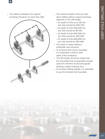 217DEEP HOLE DRILLING%u2022 The distance between the support bushings should be no more than 30D.max. 30Dmax. 30D %u2022 The minimum depth of the pre hole, when drilling without support bushings, depends on the drill length:%u2022 for depth of hole up to 12D the pre hole should be 0.5D-1.0D%u2022 for depth of hole 20D-30D the pre hole should be 8D-12D%u2022 for depth of hole 40D-50D the pre hole should be 20D-25D%u2022 for depth of hole 60D-80D the pre hole should be 30D-40D%u2022 Oil coolant in deep drilling is preferable over emulsion.%u2022 To minimize drill runout, if possible it is preferable to drill on both sides of the workpiece.%u2022 The drill length should be longer than the requested hole to guarantee enough space for machine accessories (guide bushing, support bushing, etc.).%u2022 To increase drilling stability, it is advisable to use the shortest drill if possible.