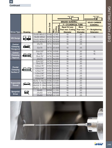 249DEEP HOLE DRILLINGContinuedDriver Type Drawing DXL Driver CodeF FBRAZED GUNDRILL SOLID CARBIDE GUNDRILLMax.CuttingDiameterF = CYLINDRICAL TUBEEqual Or LessThan max. CuttingDiameterMoreThan max.DiameterF = StraighteningExtensionVDI DesignL D M10x68 M6x0.5 N%u00b068 6.749 10 2016x90 M10x1 N%u00b069 10.799 10 20 1525x112 M16x1.5 N%u00b070 19.509 10 2536x135 M24x1.5 N%u00b071 30.609 10 25Central Clamping HexagonalLD25x70 N%u00b072 19.509 10 2532x70 N%u00b073 25.609 10 25Central Clamping TaperedL.50x1.50%u201d N%u00b074 8.599 10 20 1516x70 N%u00b075 12.099 10 20 15.75x2.75%u201d N%u00b076 14.099 10 2020x70 N%u00b077 16.099 10 20 15Frontal Clamping Surface 2%u00b0LD.50x1.50%u201d N%u00b078 9.699 10 20.75x2.75%u201d N%u00b079 14.899 10 201.00x2.75%u201d N%u00b080 19.509 10 251.00x3.94%u201d N%u00b081 19.509 10 251.25x2.75%u201d N%u00b082 25.609 10 251.25x3.94%u201d N%u00b083 25.609 10 251.50x2.75%u201d N%u00b084 32.609 10 251.50x3.94%u201d N%u00b085 32.609 10 25Trapezoidal ThreadLTr D16x112 Tr 16x1.5 N%u00b086 13.599 10 2020x126 Tr 20x2 N%u00b087 17.099 10 2028x126 Tr 28x2 N%u00b088 25.599 10 2536x162 Tr 36x2 N%u00b089 32.599 10 25Spraymist DriverLD16x40 N%u00b090 12.399 10 2025x50 N%u00b091 19.509 10 2535x60 N%u00b092 26.599 10 25