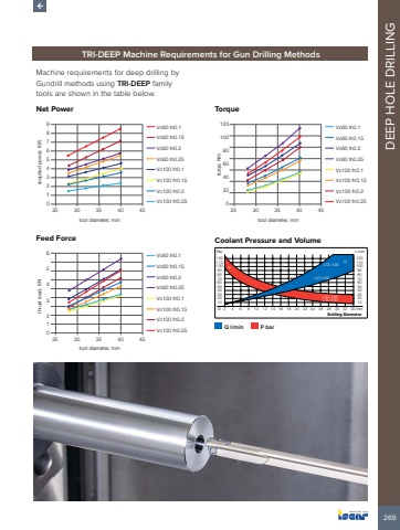 269DEEP HOLE DRILLINGTRI-DEEP Machine Requirements for Gun Drilling MethodsMachine requirements for deep drilling byGundrill methods using TRI-DEEP familytools are shown in the table below.Net PowerVc60 fn0.1Vc60 fn0.15Vc60 fn0.2Vc60 fn0.25Vc100 fn0.1Vc100 fn0.15Vc100 fn0.2Vc100 fn0.25987654321025 30 35 40 45tool diameter, mmrequired power, KWFeed ForceVc60 fn0.1Vc60 fn0.15Vc60 fn0.2Vc60 fn0.25Vc100 fn0.1Vc100 fn0.15Vc100 fn0.2Vc100 fn0.25654321025 30 35 40 45tool diameter, mmthrust load, KNTorqueVc60 fn0.1Vc60 fn0.15Vc60 fn0.2Vc60 fn0.25Vc100 fn0.1Vc100 fn0.15Vc100 fn0.2Vc100 fn0.2512010080604020025 30 35 40 45tool diameter, mmtorqe, NmCoolant Pressure and Volume1024 6 8 10 12 14 16 18 20 22 24 26 28 30 32 40 mm2030405060708090100110120%u00d8102030405060708090100110120L/minQ L/D>100 PL/D<100L/D<100L/D>100BarDrilling DiameterQ l/min P bar