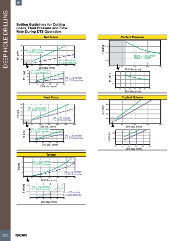 302 ISCAR DEEP HOLE DRILLINGSetting Guidelines for CuttingLoads, Fluid Pressure and FlowRate During DTS OperationNet Power0 10 20 30 40 5051015200 50 100 150 200 250 30020406080Pc (kW)Pc (kW)Vc = 100 m/minf = 0.25 mm/revVc = 100 m/minf = 0.25 mm/revVc = 70 m/minf = 0.15 mm/revVc = 70 m/minf = 0.15 mm/revDrill dia. (mm)Drill dia. (mm)Feed Force0 10 20 30 40 505100 50 100 150 200 250 3001020304050Ff (kN)Ff (kN)Vc = 100 m/minf = 0.25 mm/revVc = 100 m/minf = 0.25 mm/revVc = 70 m/minf = 0.15 mm/revVc = 70 m/minf = 0.15 mm/revDrill dia. (mm)Drill dia. (mm)Torque0 10 20 30 40 500.10.20 50 100 150 200 250 3002468T (kNm)T (kNm)Vc = 100 m/minf = 0.25 mm/revVc = 100 m/minf = 0.25 mm/revVc = 70 m/minf = 0.15 mm/revVc = 70 m/minf = 0.15 mm/revDrill dia. (mm)Drill dia. (mm)Coolant Pressure0 10 20 30 40 50 60 700.511.50 50 100 150 2000.50.250.75 P (MPa)P (MPa)1MPa = 1.0 N/mm21Mpa %u2248 10 atmDrill dia. (mm)Drill dia. (mm)Coolant Volume0 10 20 30 40 50501000 50 100 150 200100200300400q (l/min)q (l/min)Drill dia. (mm)Drill dia. (mm)