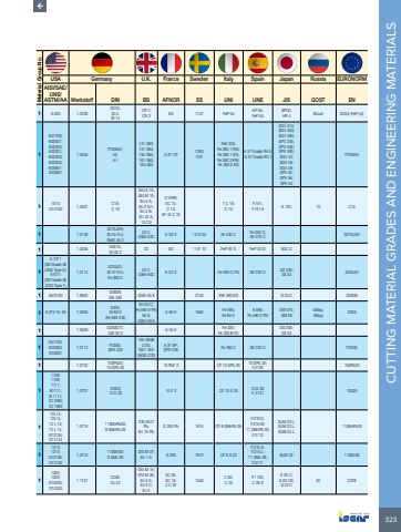 323CUTTING MATERIAL GRADES AND ENGINEERING MATERIALS Material Group No.USA Germany U.K. France Sweden Italy Spain Japan Russia EURONORMAISI/SAE/UNS/ASTM/AA Werkstoff DIN BS AFNOR SS UNI UNE JIS GOST EN1 A 620 1.0338DC04;St 4;St 14CR 1;CR 2 ES 1147 FeP 04 AP 04;FeP 04SPCE;HR 4 08JuA DC04 (FeP 04)1K01700;K02001;K02200;K02201;K02203;K02503;K02601;K028011.0345P235GH;HI;H I141-360;151-360;154-360;161-360;164-360A 37 CP 1330;1331FeE 235;Fe 360 1 KW;Fe 360 1 KG;Fe 360 2 KW;Fe 360 2 KGA 37 Grado RA II;A 37 Grado RC ISGV 410;SGV 450;SGV 480;SPV 235;SPV 450;SPV 490;SGV 42;SGV 46;SGV 49;SPV 24;SPV 46;SPV 50P235GH1 1010;G10100 1.0301 C10;C 10040 A 10;045 M 10;En 2 A;En 2 A/1;En 2 B;En 32 A;10 CSC10RR;XC 10;C 10;AF 34 C 101 C 10;C 10F.151;F.151.A S 10C 10 C101 1.0149S275JOH;St 44-3 U;RoSt 44-243 C;4360-43C E 28-3 1412-04 Fe 430 C Fe 430 C;AE 275 C S275JOH1 1.0226 DX51D;St 02 Z Z2 GC 1151 10 FeP 02 G FeP 02 G SGC C1A 1011 (SS Grade 36 (230) Type 2);A1011 (SS Grade 36 (250) Type 1)1.0114S235JO;St 37-3 U;Fe 360 C40 C;4360-40C E 24-3 Fe 360 C FN AE 235 C SS 330;SS 34 S235JO1 A572-60 1.8900 S380N;StE 380 4360 55 E 2145 FeE 390 KG S 25 C S380N1 A 572 Gr. 65 1.0060E335;St 60-2 (Fe 590-2 B)En 55 C;Fe 590-2-FN;55 E;4360-55 EA 60-2 1650 Fe 590;Fe 60-2A 590;Fe 590-2 FNSM 570;SM 58St6ps;St6sp E3351 1.0028 S250G1T;USt 34-2 A 34-2 Fe 330;Fe 330 B FUSS 330;SS 341K01700;K02200;K028011.0112 P235S;SPH 235164-360B LT20;1501-164-360B LT20A 37 AP;SPH 235 Fe 360 C AE 235 C P235S1 1.0722 10SPb20;10 SPb 20 10 PbF 2 CF 10 SPb 20 10 SPb 20;F.2122 10SPb2011108;1109;1111;B1111;B 1111;G11080;G110901.0721 10S20;10 S 20 10 F 2 CF 10 S 20 10 S 20;F. 2121 10S20112L13;12L14;12 L 13;12 L 14;G12134;G121441.0718 11SMnPb30;9 SMnPb 28230 M 07 Pb;En 1A PbS 250 Pb 1914 CF 9 SMnPb 28F.210.C;F.210.M;11 SMnPb 28;F.2112SUM 22 L;SUM 23 L;SUM 24 L11SMnPb3011213;1215;G12130;G121501.0715 11SMn30;9 SMn 28230 M 07;En 1 A S 250 1912 CF 9 S 22F.210.A;F.210.L;11 SMn 28;F.2111SUM 22 11SMn3011020;1023;G10200;G102301.1151 C22E;Ck 22055 M 15;070 M 20;En 3 A;En 3 C;En 2XC 25;XC 18;2 C 221450 C 20;C 25F.1120;C 25 KS 20 C;S 20 CK;S 22 C20 C22E