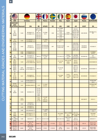 342 ISCAR CUTTING MATERIAL GRADES AND ENGINEERING MATERIALS Material Group No.USA Germany U.K. France Sweden Italy Spain Japan Russia EURONORMAISI/SAE/UNS/ASTM/AA Werkstoff DIN BS AFNOR SS UNI UNE JIS GOST EN14347;348;S34700;S348001.4550 X6CrNiNb18-10;X 6 CrNiNb 18 10347 S 31;ANC 3 grade B;ANC 3 B;347 S 20;347 S 40;347 S 50;347 S 51Z 6 CNNb 18-10 2338X 6 CrNiNb 18 11;X 6 CrNiNb 18 11 KG;X 6 CrNiNb 18 11 KW;X 6 CrNiNb 18 11 KTF.3524;X 6 CrNiNb 18 10SUS 347;SUS 347 FB;SUS 347 HTB;SUS 347 TB;SUS 347 TKA;SUS 347 TP;SUS F 34708Ch18N12BX6CrNiNb18-10;58F;14 318;S31803 1.4583 X10CrNiMoNb18-12;X 10CrNiMoNb 18 12Z 6 CNDNb 18-12X 6 CrNiMoNb 20 1114310H;310 H;310S;310 S;S31008;S310091.4845 X8CrNi25-21;X 12 CrNi 25 21310 S 16;310 S 24;310 S 25;310 S 31Z 8 CN 25-20;Z 12 CN 25-20;Z 12 CN 26-212361 X 6 CrNi 25 20 (X 6 CrNi 25 20) F.331SUS 310 S;SUS 310 FB;SUS 310 STG;SUS 310 STP;SUS310 TB;SYS Y 310 S10Ch23N18;20Ch23N18 X12CrNi25-2114 1.4465;1.4466X1CrNiMoN25-22-2;X 2 CrNiMoN 25 22 7X1CrNiMoN 25-22-214 309;S30900 1.4828 X15CrNiSi20-12;X 15 CrNiSi 20 12 309 S 24Z 9 CN 24-13;Z 17 CNS 20-12X 16 CrNi 23 14F.3312;X 15 CrNiSi 20-12SUH 309;SUS 309 TB;SUS 309 TP20Ch20N14S2 58C;X15CrNiSi20-1214HK;J94203;J94204;J942241.4848 GX40CrNiSi25-20;G-X 40 CrNiSi 25 20310 C 40;310 C 45G X 40 CrNi 26 20AM-X 40 CrNi 25 20;F.8452SCH 21;SCH 22;SCH 22 XGX40CrNiSi25-2014HK 30;J93503;J94003;J94013;HH1.4837;1.4848+NbGX40CrNiSi25-12;G-X 40 CrNiSi 25 12 309 C 30 G X 35 CrNi 25 12SCH 13;SCH 13 A;SCH 13 X;SCH 17;SCS 1740Ch24N12SL GX40CrNiSi25-1214310;314;S3100;S31400;S315001.4841 X15CrNiSi25-21;X 15 CrNiSi 25 20 314 S 25 Z 15 CNS 25-20 X 16 CrNiSi 25 20F.3310;X 15 CrNiSi 25-20SUH 310;SUS 310 TB;SUS Y 31020Ch25N20S2 X15CrNiSi25-2114 1.4849 GX40NiCrSiNb38-19;G-X 40 NiCrSi 38 18GX40NiCrSiNb 38-1914S32760;SA351/995;25Cr-7Ni-Mo-N1.4501 X2CrNiMoCuWN25-7-4 1.4501 Z 3 CNDU 25-06 AzX2CrNiMoCuWN 25-7-414 348;S34800 1.4546 X5CrNiNb18-102 S.130;2 S.143;3 S.144;3 S.145;S.525;S.52714 1.4544;1.4544.9S.524;S.526;2 S 129Z 10 CNT 18-11;9160/C 63;9160C201X 6 CrNiTi 18 11 08Ch18N12T FE-PA 1314 1.6900 X12CrNi18-9;X 12 CrNi 18 914 1.4829 X12CrNi22-12;X 12 CrNi 22 1214 1.4882 X50CrMnNiNbN21-9 Z 50 CMNNb 21.09X50CrMnNiNbN 21-914316N;316 N;J928041.4409 GX2CrNiMo19-11-2;G-X 2 CrNiMo 19 11 2Z 3 CND 19.10 MGX2 CrNiMo 19 11AM-X 2 CrNiMo 19 11;F.8415SCS 16 A;SCS 16 AX SCS 16 AXNGX2CrNiMo 19-11-214304L;304 L J92500;J926201.4309 GX2CrNi19-11 304 C 12 Z 3 CN 19.10 M GX 2 CrNi 19 10AM-X 2 CrNi 19 10;F.8412SCS 19;SCS 19 A GX2CrNi19-1115A48 25 B;Class 25;No 25 B0.6015EN-GJL-150;GG 15;EN-JL 1020Grade 150 Ft 15 D;R 15 D 01 15-00 G 14;G 15 FG 15 FC 15;FC 150 SCh 15 EN-GJL-150;EN-JL 102015A48-30 B;Class 30, No.30 B0.6020EN-GJL-200;GG 20;EN-JL 1030Grade 220 Ft 20 D 01 20-00 G 20;Gh 190 FG 20 FC 20;FC 200 SCh 20 EN-GJL-200;EN-JL 1030
