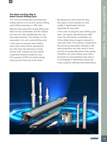 35GENERAL DRILLING HANDBOOKThe Quick and Easy Way toSelect Correct Drilling CycleThe most recommended and productive drilling method is to use the canned drilling cycle without pecking, i.e. G81 code. Efficient chip evacuation during drilling can often be very problematic and the deeper the hole, the more problematic the chip evacuation process. The solution to chip evacuation is to use a peck drilling cycle. In the case of using the peck drilling cycle with a short retract, denoted by the G73 code, the drill does not fully exit the hole. Instead, the tool retracts a specified distance inside the hole. The purpose of G73 is to break stringy chips and pull them out of the holes. By keeping the drill inside the hole, the impact of drill vibration on hole quality is significantly reduced, especially for long drills.In the case of using the peck drilling cycle with a full retract, denoted by the G83 code, the drill retracts completely out of the drilled hole at regular intervals to evacuate chips. This method, compared to the previously described methods, is the least productive and may result in lower tool life and potentially worse hole quality. Therefore, the peck drilling cycle with a full retract is recommended only when it is not feasible to effectively remove the chips using the methods described above.