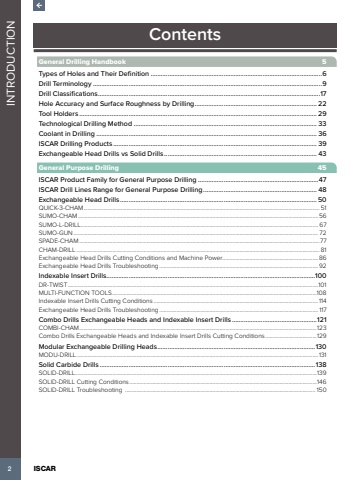 2 INTRODUCTIONISCARContentsGeneral Drilling Handbook 5Types of Holes and Their Definition .....................................................................................................6Drill Terminology .......................................................................................................................................9Drill Classifications...................................................................................................................................17Hole Accuracy and Surface Roughness by Drilling........................................................................ 22Tool Holders ............................................................................................................................................ 29Technological Drilling Method ............................................................................................................ 33Coolant in Drilling .................................................................................................................................. 36ISCAR Drilling Products ........................................................................................................................ 39Exchangeable Head Drills vs Solid Drills .......................................................................................... 43General Purpose Drilling 45ISCAR Product Family for General Purpose Drilling .......................................................................47ISCAR Drill Lines Range for General Purpose Drilling................................................................... 48Exchangeable Head Drills....................................................................................................................50QUICK-3-CHAM..................................................................................................................................................................... 51SUMO-CHAM........................................................................................................................................................................56SUMO-L-DRILL...................................................................................................................................................................... 67SUMO-GUN........................................................................................................................................................................... 72SPADE-CHAM........................................................................................................................................................................77CHAM-DRILL .......................................................................................................................................................................... 81Exchangeable Head Drills Cutting Conditions and Machine Power...................................................................86Exchangeable Head Drills Troubleshooting ...............................................................................................................92Indexable Insert Drills...........................................................................................................................100DR-TWIST...............................................................................................................................................................................101MULTI-FUNCTION TOOLS...............................................................................................................................................108Indexable Insert Drills Cutting Conditions ...................................................................................................................114Exchangeable Head Drills Troubleshooting ...............................................................................................................117Combo Drills Exchangeable Heads and Indexable Insert Drills ..................................................121COMBI-CHAM......................................................................................................................................................................123Combo Drills Exchangeable Heads and Indexable Insert Drills Cutting Conditions....................................129Modular Exchangeable Drilling Heads.............................................................................................130MODU-DRILL.........................................................................................................................................................................131Solid Carbide Drills ...............................................................................................................................138SOLID-DRILL.........................................................................................................................................................................139SOLID-DRILL Cutting Conditions...................................................................................................................................146SOLID-DRILL Troubleshooting ..................................................................................................................................... 150