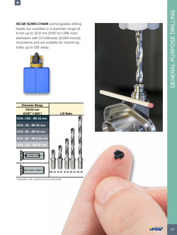 57GENERAL PURPOSE DRILLINGISCAR SUMO-CHAM exchangeable drilling heads are available in a diameter range of 4 mm up to 32.9 mm (0.157 to 1.295 inch) diameters with 0.1 millimeter (0.004 inches) increments and are suitable for machining holes up to 12D deep. Diameter RangeL/D Ratio%u00d84-32 mm (0.157%u201d-1.260%u201d)DCN...1.5D - %u00d86-32 mmDCN...3D - %u00d84-32 mmDCN...5D - %u00d84-32 mmDCN...8D - %u00d84.5-32 mmDCN...12D - %u00d86-32 mm1.5%u00d7D 3%u00d7D 5%u00d7D 8%u00d7D 12%u00d7D* Avaliable with cylidrical or one flat shank