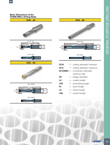 85GENERAL PURPOSE DRILLINGBasic Dimensions of theCHAM-DRILL Drilling BodyDCM %u2026-3DD = 7.5 - 21.9D = 22 - 25.9LULPR OAL LSDCN-DCX DCONMS DFPLDCM %u2026-5DDCN-DCX DCONMSh6 DFLPR LSOALLUPLDC = 7.5-21.9DC = 22-25.9DCM %u2026-8DDCN-DCX DCONMSh6 DFLUPLLPR OALDC= 10-20.9DC= 21-25.9LSDCN %u2014 cutting diameter minimumDCX %u2014 cutting diameter maximumDCONMS %u2014 connection diameter machine sideDF %u2014 flange diameterLU %u2014 usable lengthLPR %u2014 protruding lengthPL %u2014 point lengthLS %u2014 shank lengthOAL %u2014 overall length