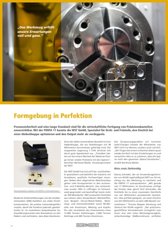 %u201eDas Werkzeug erf%u00fcllt unsere Erwartungen voll und ganz.%u201c Formgebung in PerfektionProzesssicherheit und eine lange Standzeit sind f%u00fcr die wirtschaftliche Fertigung von Pr%u00e4zisionsbauteilen unverzichtbar. Mit der PENTA 17 konnte die WST GmbH, Spezialist f%u00fcr Dreh- und Fr%u00e4steile, den Einstich bei einer Abdeckkappe optimieren und den Output mehr als verdoppeln.Moderne Sicherheitsl%u00f6sungen wie das Antiblockiersystem (ABS) bestehen aus vielen Einzelkomponenten, die pr%u00e4zise ineinandergreifen m%u00fcssen, damit die Funktion jederzeit gew%u00e4hrleistet ist. So modulieren beispielsweise Hydraulikkomponenten den Bremsdruck an den R%u00e4dern und verhindern, dass diese blockieren.Eines der dabei verwendeten Bauteile ist eine Abdeckkappe, die aus Stahlstangen mit 38 Millimetern Durchmesser gefertigt wird. Die eingesetzte Legierung 1.7149 zeichnet sich durch gute Spanbarkeit aus. %u201eTrotzdem hatten wir bei einem Wechsel der Material-Charge immer wieder Probleme mit den Sp%u00e4nen%u201c, berichtet Berthold M%u00fcller, Prozessoptimierer bei WST.Die WST GmbH hat sich auf Fr%u00e4s- und Drehteile spezialisiert und beliefert die Industrie mit komplexen, qualitativ hochwertigen L%u00f6sungen. Neben dem allgemeinen Maschinenbau gehen viele Komponenten in den Automotive- und E-Mobility-Bereich. Das Unternehmen wurde 1993 in L%u00f6ffingen im Schwarzwald gegr%u00fcndet und besch%u00e4ftigt heute mehr als 700 Mitarbeiter. WST produziert Drehteile aus nahezu allen zerspanbaren Werkstoffen, zum Beispiel Chrom-Nickel-St%u00e4hle, Werkzeug- und Automatenst%u00e4hle sowie NE-Metalle wie Aluminium, Messing und Kupfer.Pro Jahr verarbeitet das Unternehmen etwa 15.000 Tonnen Stahlstangen, 3.000 Tonnen Rohlinge und 400 Tonnen Aluminium.Das Zerspanungsproblem mit manchen Stahl-Chargen kostete die Mitarbeiter von WST nicht nur Nerven, sondern auch viel Zeit.%u201eWir fingen bei einem schlechten Batch quasi wieder bei Null mit den Einstellungen an und versuchten alles so zu justieren, dass die Sp%u00e4ne nicht den gesamten Ablauf blockierten%u201c, erz%u00e4hlt Berthold M%u00fcller.Klein, stark, f%u00fcnfstrahligDanny Schr%u00f6del, der als Anwendungstechniker von ISCAR regelm%u00e4%u00dfig bei WST vor Ort ist, schlug vor, das Werkzeug zu wechseln und die PENTA 17 auszuprobieren: %u201eMit gerade mal 17 Millimetern im Durchmesser verf%u00fcgt der Einsatz %u00fcber gleich f%u00fcnf Schneiden, die Drehteile bis zu einer maximalen Stechtiefe von vier Millimetern prozesssicher bearbeiten. Also perfekt geeignet, um einen Einstich von drei Millimetern an dem ABS-Bauteil vorzunehmen.%u201c Thomas Nopper, Beratung und Verkauf bei ISCAR erg%u00e4nzt: %u201eDer pr%u00e4zisionsgeschliffene Schneideinsatz erm%u00f6glicht zum einen eine sehr hohe Wechselgenauigkeit, zeitaufw%u00e4ndige Ma%u00dfkorrekturen entfallen Werkzeughalter, Adapter und PENTA 17-Schneideinsatz.38