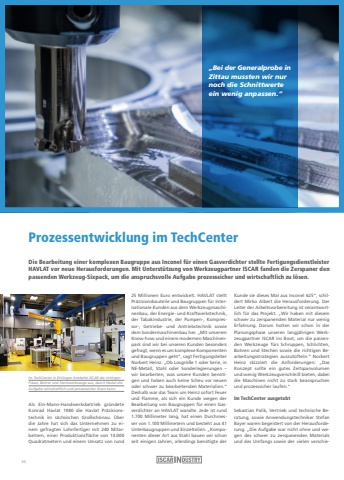 Prozessentwicklung im TechCenterDie Bearbeitung einer komplexen Baugruppe aus Inconel f%u00fcr einen Gasverdichter stellte Fertigungsdienstleister HAVLAT vor neue Herausforderungen. Mit Unterst%u00fctzung von Werkzeugpartner ISCAR fanden die Zerspaner den passenden Werkzeug-Sixpack, um die anspruchsvolle Aufgabe prozesssicher und wirtschaftlich zu l%u00f6sen.%u201eBei der Generalprobe in Zittau mussten wir nur noch die Schnittwerte ein wenig anpassen.%u201cAls Ein-Mann-Handwerksbetrieb gr%u00fcndete Konrad Havlat 1980 die Havlat Pr%u00e4zisionstechnik im s%u00e4chsischen Gro%u00dfsch%u00f6nau. %u00dcber die Jahre hat sich das Unternehmen zu einem gefragten Lohnfertiger mit 240 Mitarbeitern, einer Produktionsfl%u00e4che von 14.000 Quadratmetern und einem Umsatz von rund 25 Millionen Euro entwickelt. HAVLAT stellt Pr%u00e4zisionsbauteile und Baugruppen f%u00fcr internationale Kunden aus dem Werkzeugmaschinenbau, der Energie- und Kraftwerkstechnik, der Tabakindustrie, der Pumpen-, Kompressor-, Getriebe- und Antriebstechnik sowie dem Sondermaschinenbau her. %u201eMit unserem Know-how und einem modernen Maschinenpark sind wir bei unseren Kunden besonders gefragt, wenn es um komplexe Komponenten und Baugruppen geht%u201c, sagt Fertigungsleiter Norbert Heinz. %u201eOb Losgr%u00f6%u00dfe 1 oder Serie, in NE-Metall, Stahl oder Sonderlegierungen %u2013 wir bearbeiten, was unsere Kunden ben%u00f6tigen und haben auch keine Scheu vor neuen oder schwer zu bearbeitenden Materialien.%u201c Deshalb war das Team um Heinz sofort Feuer und Flamme, als sich ein Kunde wegen der Bearbeitung von Baugruppen f%u00fcr einen Gasverdichter an HAVLAT wandte. Jede ist rund 1.700 Millimeter lang, hat einen Durchmesser von 1.100 Millimetern und besteht aus 41 Unterbaugruppen und Einzelteilen. %u201eKomponenten dieser Art aus Stahl bauen wir schon seit einigen Jahren, allerdings ben%u00f6tigte der Kunde sie dieses Mal aus Inconel 625%u201c, schildert Mirko Albert die Herausforderung. Der Leiter der Arbeitsvorbereitung ist verantwortlich f%u00fcr das Projekt. %u201eWir haben mit diesem schwer zu zerspanenden Material nur wenig Erfahrung. Darum holten wir schon in der Planungsphase unseren langj%u00e4hrigen Werkzeugpartner ISCAR ins Boot, um die passenden Werkzeuge f%u00fcrs Schruppen, Schlichten, Bohren und Stechen sowie die richtigen Bearbeitungsstrategien auszut%u00fcfteln.%u201c Norbert Heinz skizziert die Anforderungen: %u201eDas Konzept sollte ein gutes Zeitspanvolumen und wenig Werkzeugverschlei%u00df bieten, dabei die Maschinen nicht zu stark beanspruchen und prozesssicher laufen.%u201cIm TechCenter ausgetobtSebastian Palik, Vertrieb und technische Beratung, sowie Anwendungstechniker Stefan Bayer waren begeistert von der Herausforderung. %u201eDie Aufgabe war nicht ohne und wegen des schwer zu zerspanenden Materials und des Umfangs sowie der vielen verschieIm TechCenter in Ettlingen knobelte ISCAR die richtigen Fr%u00e4ser, Bohrer und Stechwerkzeuge aus, damit Havlat die Aufgabe wirtschaftlich und prozesssicher l%u00f6sen kann.46