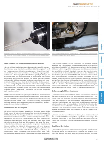 FR%u00c4SEN BOHREN DREHEN STECHEN INDUSTRIENNEWSLange Standzeit und hohe Oberfl%u00e4cheng%u00fcte dank K%u00fchlung%u201eBei der Miniaturbearbeitung legen die Anwender nat%u00fcrlich auch gro%u00dfen Wert auf lange Standzeiten und hohe Oberfl%u00e4cheng%u00fcten%u201c, wei%u00df der Produktmanager. %u201eHierbei unterst%u00fctzt unsere zielgerichtete Hochdruckk%u00fchlung direkt in der Schnittzone.%u201c Im Werkzeug angelegte K%u00fchlmittelkan%u00e4le %u2013 str%u00f6mungsoptimiert und additiv gefertigt %u2013 bringen das K%u00fchlmittel direkt und mit hohem Druck an die Schneide, was die dort entstehende W%u00e4rme optimal ableitet. Der Nutzer profitiert dadurch mehrfach: Die K%u00fchlung schont das Werkzeug und verl%u00e4ngert die Standzeit. Zudem hilft der hohe Druck des K%u00fchlmittels bei der Spanevakuierung und erm%u00f6glicht glattere Oberfl%u00e4chen mit deutlich weniger Riefen durch Flugsp%u00e4ne. %u201eBei der Spankontrolle leisten auch neu entwickelte Spanformer einen wichtigen Beitrag und sorgen f%u00fcr stabile Prozesse und eine h%u00f6here Produktivit%u00e4t%u201c, sagt Keller. %u201eSo kann der Anwender auch mannlos arbeiten.%u201c ISCAR hat zahlreiche Werkzeugl%u00f6sungen im Portfolio, die Anwendern diese Vorteile %u2013 Materialeinsparungen, gutes Handling, lange Standzeiten und hohe Oberfl%u00e4cheng%u00fcten %u2013 bei der Miniaturbauteil-Bearbeitung verf%u00fcgbar machen. Daniel Keller: %u201eUnser PICCO-System beispielsweise deckt das gesamte Spektrum ab, dazu kommen spezialisierte Werkzeuge zum Drehen, Stechen und Bohren.%u201cDer Generalist: Das PICCO-SystemMit seinen multifunktionalen, jetgek%u00fchlten Eins%u00e4tzen bietet ISCARs PICCO-System f%u00fcr jeden Anwendungsfall das passende Werkzeug. Mit PICCOCUT stellt der Werkzeugspezialist dem Anwender alle g%u00e4ngigen Geometrien von Schneideins%u00e4tzen f%u00fcr ein breites Spektrum der Innenbearbeitung zur Verf%u00fcgung. Diese bestehen aus einer TiAlN-PVD-beschichteten Feinstkornsorte IC908 und verf%u00fcgen %u00fcber eine innere K%u00fchlmittelzuf%u00fchrung direkt zur Schneidkante. Das sorgt f%u00fcr l%u00e4ngere Standzeiten und bessere Spankontrolle. F%u00fcr gr%u00f6%u00dfere Stabilit%u00e4t und h%u00f6here Pr%u00e4zision hat ISCAR die Schneideins%u00e4tze mit einer l%u00e4ngeren Klemmfl%u00e4che versehen und diese um 90 Grad gedreht. %u201eDamit kann der Anwender prozesssicher und effizient drehen, einstechen, gewindedrehen, fasen, formdrehen und axialeinstechen%u201c, sagt Keller.Im Zuge seiner neuen LOGIQUICK-Kampagne hat ISCAR seine PICCOLinie nochmal erweitert. F%u00fcr die hochpr%u00e4zise und effiziente Innenbearbeitung von Kleinbauteilen auf Langdrehern gibt es jetzt den dreischneidigen PICCO3CUT mit Durchmessern zwischen drei und sieben Millimetern. Seine zielgerichtete K%u00fchlung an allen Schneiden minimiert den Verschlei%u00df, erh%u00f6ht die Standzeit, verbessert die Oberfl%u00e4cheng%u00fcte und erleichtert die Spanabfuhr. Ebenfalls neu in der PICCO-Linie ist der Wechselkopfbohrer PICCOSUMOCHAM. %u201eDas extrem kleine Werkzeug mit Durchmessern zwischen vier und zehn Millimetern l%u00e4sst sich bequem mit Bohrk%u00f6pfen mit unterschiedlichen Geometrien best%u00fccken und verf%u00fcgt %u00fcber interne K%u00fchlmittelkan%u00e4le f%u00fcr eine effiziente K%u00fchlung%u201c, erkl%u00e4rt Keller. %u201eDieses Neuheitentrio rundet die PICCOINDEX-Eins%u00e4tze ab.%u201c Das kleine Wendeschneidplatten-Werkzeug ist vielseitig einsetzbar, in Durchmessern von 4,5 bis sechs Millimetern erh%u00e4ltlich und verf%u00fcgt ebenfalls %u00fcber interne Kan%u00e4le zur zielgerichteten K%u00fchlung.Drehwerkzeug im kleinen Durchmesser%u201eF%u00fcr eine maximale Flexibilit%u00e4t beim Drehen von Kleinteilen haben wir die Wechselkopf-Werkzeuge der NEOSWISS-Reihe im Portfolio%u201c, sagt Daniel Keller. Das modulare Schnellwechselsystem f%u00fcr Langdreher besteht aus einem Schaft und verschiedenen Werkzeugk%u00f6pfen f%u00fcr alle typischen Bearbeitungen wie Drehen, Ab- und Einstechen, Gewindeoder Stechdrehen. Der Schaft bleibt beim Wechsel in der Maschine. Der Maschinenbediener entfernt nur den Werkzeugkopf, den er nach dem Schneiden- oder Kopfwechsel einfach wieder einsetzt. Einmessen oder erneutes Anfahren entfallen, und die Anlage ist praktisch ohne R%u00fcstzeit sofort einsatzbereit.%u201eUm noch schneller und effizienter zu drehen, kann der Anwender auf den neuen QUICKSWISS zur%u00fcckgreifen%u201c, sagt der Produktmanager . Das modulare Drehsystem ist mit einer stabilen Plattenklemmung ausgestattet und kann damit auch f%u00fcr pr%u00e4zises R%u00fcckw%u00e4rtsdrehen eingesetzt werden.Spezialisten f%u00fcrs Stechen%u201eVerschiedene Spanformer und Geometrien sorgen bei den Stechwerkzeugen der PENTACUT-Linie daf%u00fcr, dass Anwender eine effektive Spankontrolle besitzen und auch anspruchsvolle Materialien mit hoher Dank Schneiden mit Schnittbreiten zwischen 0,8 und 1,2 Millimetern reduziert der DOGRIP den Rohstoffverbrauch beim Stechen deutlich.F%u00fcr die hochpr%u00e4zise und effiziente Innenbearbeitung von Kleinbauteilen auf Langdrehern gibt es jetzt den dreischneidigen PICCO3CUT mit Durchmessern zwischen drei und sieben Millimetern.59