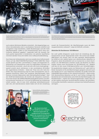 F%u00fcr die Drehbearbeitungen (Schruppen und Schlichten) kommt der ALUPTURN aus der LOGIQ-Produktlinie zum Einsatz, dessen Wendeplatten insbesondere f%u00fcr die Bearbeitung von Aluminium entwickelt wurden.auch anderen Nichteisen-Metallen entwickelt. %u201eDie doppelseitigen, positiven Schneideins%u00e4tze sind in verschiedenen Versionen erh%u00e4ltlich und erm%u00f6glichen lange Standzeiten, stabile Bearbeitungen und sehr hohe Oberfl%u00e4cheng%u00fcten. Zudem ist die Prozesssicherheit durch einen kontrollierten Spanbruch gegeben%u201c, begr%u00fcndet Halili die Auswahl. Der stark positive Spanwinkel in Kombination mit polierten Spanfl%u00e4chen minimiert dar%u00fcber hinaus die Gefahr einer Aufbauschneidenbildung.Zum Fr%u00e4sen der Schl%u00fcsselweiten setzt man anstelle eines Vollhartmetallfr%u00e4sers auf den MULTI-MASTER-Planfr%u00e4skopf T-FACE (MM FM). Dieser wurde speziell zum Plan- und Eckfr%u00e4sen in engen und begrenzten Arbeitsr%u00e4umen auf Fr%u00e4smaschinen sowie f%u00fcr angetriebene Einheiten auf Drehmaschinen entwickelt. %u201eDurch die sehr, sehr kurze Auskragl%u00e4nge %u2013 speziell erreicht durch Aufnahmen in den verschiedenen ER-Gr%u00f6%u00dfen der angetriebenen Einheiten %u2013 bietet der T-Face eine sehr hohe Stabilit%u00e4t. Eine enge Zahnteilung sorgt f%u00fcr hohe Vorschubwerte und angepasste Geometrien liefern eine exzellente Oberfl%u00e4cheng%u00fcte. Dazu kommen minimale Nebenzeiten dank Wechselkopftechnologie%u201c, fasst der ISCAR-Vertriebstechniker die Vorteile des Fr%u00e4ssystems zusammen.Durch den Einsatz des SUMOCHAM-Wechselkopfbohrsystems zum Bohren konnte der Vorschub von f = 0,15 auf 0,5 Millimeter pro Umdrehung erh%u00f6ht werden. %u201eDas ist zwar nicht unbedingt taktzeitbestimmend, aber sehr, sehr beeindruckend. Zudem haben sich mit der Umstellung sowohl die Prozesssicherheit, die Oberfl%u00e4cheng%u00fcte sowie die Werkzeugwechselzeiten verbessert%u201c, zeigt sich Zellhofer zufrieden.Abstechen bis Durchmesser 160 MillmeterDer wohl gr%u00f6%u00dfte Zeitgewinn wurde durch die Umstellung des Abstechprozesses auf der Gegenspindel erzielt. Hier kommt das LOGIQFGRIP-System zum Einsatz, denn mit dem speziellen Werkzeughalter hat ISCAR ein sehr stabiles System zum vibrationsfreien Abstechen im Programm, deren Einsatzbereich erst vor kurzem bis zu einem Durchmesser von 160 Millimetern erweitert wurde. Die Bauteile von Worthington weisen einen Durchmesser bis 140 Millimeter auf. %u201eM%u00f6glich wird das mit den neuen D160-Spannsch%u00e4ften und -Schneidentr%u00e4gern.Die quadratischen Adapter weisen vier Plattensitze auf%u201c, geht Halili ins Detail. Das System ist f%u00fcr alle Maschinentypen geeignet und somit auch sehr flexibel zum X- und Y-Abstechen einsetzbar. Ein gro%u00dfer Vorteil der LOGIQFGRIP-Spannsch%u00e4fte ist ihre robuste Konstruktion. %u201eDiese erm%u00f6glicht vibrationsfreies Abstechen auf der X- und Y-Achse, verl%u00e4ngert die Standzeiten der Schneideins%u00e4tze und erh%u00f6ht die Oberfl%u00e4cheng%u00fcten und Planebenheiten%u201c, erg%u00e4nzt der Zerspanungstechniker. Zudem l%u00e4sst sich mit der stabilen L%u00f6sung der Vorschub deutlich erh%u00f6hen, die Schnittbreite bei gro%u00dfen Stechtiefen reduzieren und damit der Rohstoffverbrauch verringern.Die doppelseitigen, positiven Schneideins%u00e4tze der ALUPTURN-Produktlinie sind in verschiedenen Versionen erh%u00e4ltlich und erm%u00f6glichen lange Standzeiten, stabile Bearbeitungen undsehr hohe Oberfl%u00e4cheng%u00fcten.Patrick Zellhofer, Abteilungsleiter Werkzeugbau und Ausbildung, Worthington Cylinders GmbHDie Zusammenarbeit mit ISCAR hat sich in diesem Optimierungsprojekt als ausgezeichnet herausgestellt.Neben der kompetenten Beratung sind die Werkzeugl%u00f6sungen allesamt hochproduktiv und wirtschaftlich.68