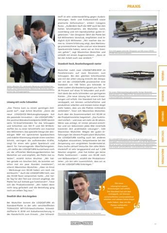 PRAXISFR%u00c4SEN BOHREN DREHEN STECHEN INDUSTRIENL%u00f6sung mit sechs Schneiden %u201eDas Thema kam zu einem g%u00fcnstigen Zeitpunkt auf%u201c, sagt Achim Wuchter. %u201eDenn die neue LOGIQUICK-Werkzeugkampagne bot die passende Innovation %u2013 die LOGIQ6TURN.%u201c Die positive Wendeschneidplatte (WSP) besitzt sechs 55-Grad-Schneiden f%u00fcr das Schruppen und Schlichten von ISO P- und ISO M-Werkstoffen bis zu einer Schnitttiefe von maximal drei Millimetern. Das spezielle Design der dreieckigen WSP mit optimierten Spanbrechern und stabiler Klemmung erlaubt einen weichen Schnitt, verringert die auftretenden Kr%u00e4fte, sorgt f%u00fcr einen sehr guten Spanbruch und damit f%u00fcr hervorragende Oberfl%u00e4cheng%u00fcten.%u201eIch stellte die LOGIQ6TURN kurzerhand noch vor der offiziellen Werkzeugpr%u00e4sentation bei Mutschler vor und empfahl, die Platte mal zu testen%u201c, erz%u00e4hlt Achim Wuchter. %u201eWir hatten gerade ein bisschen Zeit, da konnten wir schon mal ein paar Stunden investieren%u201c, scherzt Maximilian Mutschler. %u201eAber im Ernst %u2013 Werkzeuge von ISCAR haben uns noch nieentt%u00e4uscht.%u201c Auch die LOGIQ6TURN hielt, wasdas ISCAR-Team versprochen hatte. %u201eDer halbe Tag f%u00fcr den Test war sinnvoll angelegt, diePlatte hat auf Anhieb gut funktioniert%u201c, freutsich der Produktionsleiter. %u201eWir haben dannnicht lang gefackelt und die Bestellung gingnoch am selben Tag raus.%u201cDeutlich %u00fcber den AngabenBei Mutschler kommt die LOQIQ6TURN als Standard-Platte in der sehr verschlei%u00dffesten TiCN/Al2O3 MT-CVD-beschichteten Schneidstoffsorte IC 8150 mit Kobaltanreicherung in der Randschicht zum Einsatz. %u201eDer SchneidF%u00fcr einen Elektrowerkzeughersteller fertigt Mutschler Bohrspindeln aus 16MnCr5 f%u00fcr Kernbohrmaschinen in unterschiedlichen Versionen.stoff ist sehr widerstandsf%u00e4hig gegen Ausbr%u00f6ckelungen, Kerb- und Kolkverschlei%u00df sowie plastische Deformation%u201c, erkl%u00e4rt Calogero Russo. %u201eAu%u00dferdem l%u00e4uft die WSP auch bei den hohen Schnittwerten, die Mutschler nutzt, zuverl%u00e4ssig und mit reproduzierbar guten Ergebnissen.%u201c Der Zerspaner f%u00e4hrt die Platte bei 0,8 Millimetern Vorschub, empfohlen sind lediglich 0,25 Millimeter. %u201eWir machen das immer so. Unsere Erfahrung zeigt, dass Werkzeuge prozesssicherer laufen und wir eine bessere Spankontrolle haben, wenn wir an ihre Grenzen gehen%u201c, sagt Maximilian Mutschler und schlie%u00dft mit einem Augenzwinkern. %u201eDann ist bei der Arbeit auch was verdient.%u201cStandzeit hoch, Bearbeitungszeit runterMutschler nutzt zwei LOGIQ6TURN-WSP im Paralleleinsatz auf zwei Revolvern zum Schruppen. Bei den gleichen Schnittwerten wie mit der alten L%u00f6sung erreicht der Zerspaner mit der LOGIQ6TURN prozesssicher eine Standzeit von 140 Teilen pro Schneide. Er senkt zudem die Bearbeitungszeit pro Teil um 20 Prozent auf etwa 15 Sekunden und profitiert dank der sechs Schneiden von geringeren Kosten. %u201eDie neue L%u00f6sung hat unsere Erwartungen voll erf%u00fcllt. Die Standzeit hat sich fast verdoppelt, wir k%u00f6nnen wirtschaftlicher und produktiver arbeiten und m%u00fcssen keine Angst mehr haben, dass uns die Platten mittendrin zerbr%u00f6seln%u201c, freut sich Maximilian Mutschler.Auch %u00fcber die Zusammenarbeit mit ISCAR ist der Produktionsleiter begeistert. %u201eDas funktioniert einfach %u2013 und zwar seit mehr als 30 Jahren.Wenn was anliegt, ist immer jemand erreichbar und wir bekommen jedes Mal innerhalb k%u00fcrzester Zeit praktikable L%u00f6sungen%u201c, lobt Maximilian Mutschler. Wegen der guten Erfahrungen bei diesem Projekt plant Mutschler, die LOGIQ6TURN k%u00fcnftig auch bei anderen Aufgaben einzusetzen, beispielsweise bei der Zerspanung von verg%u00fctetem Sondermaterial.Dazu laufen aktuell Versuche. Der z%u00e4he Werkst%u00fcckstoff ist sehr langspanend und auf 1.200 Newton verg%u00fctet. %u201eHier hat bisher gar keine Platte funktioniert %u2013 weder von ISCAR noch von Mitbewerbern%u201c, erz%u00e4hlt der Produktionsleiter. %u201eIch bin sehr zuversichtlich, dass wir es mit der LOGIQ6TURN hinkriegen.%u201cAchim Wuchter (li.), technische Beratung und Verkauf bei ISCAR, und Produktionsleiter Maximilian Mutschler begutachten das Schruppergebnis.Maximilian Mutschler, Produktionsleiter bei MutschlerDie neue L%u00f6sung hat unsere Erwartungen voll erf%u00fcllt. Die Standzeit hat sich fast verdoppelt, wir k%u00f6nnen wirtschaftlicher und produktiver arbeiten und m%u00fcssen keine Angst mehr haben, dass uns die Platten mittendrin zerbr%u00f6seln.Zum Schruppen setzt der Zerspaner auf die neue LOGIQ6TURN-Wendeschneidplatte.Die LOGIQ6TURN bietet sechs 55-Grad-Schneiden zum Schruppen und Schlichten von ISO P- und ISO M-Werkstoffen bis zu einer Schnitttiefe von maximal drei Millimeternund erlaubt wirtschaftliches und produktives Arbeiten.37